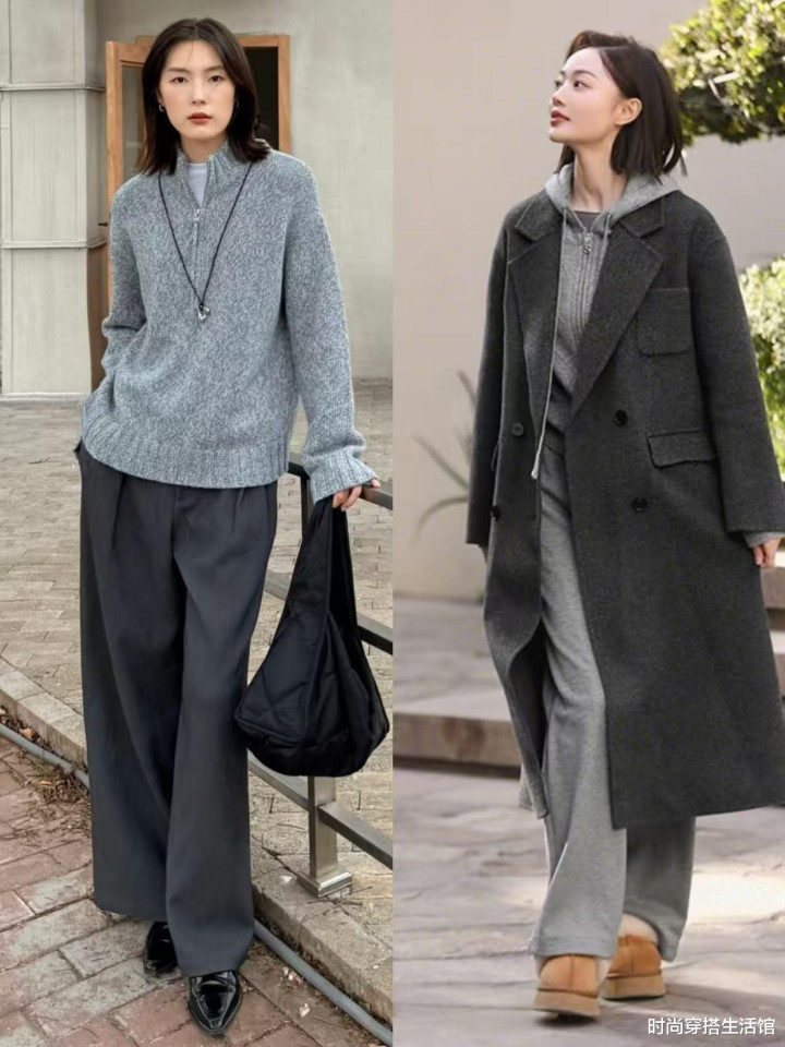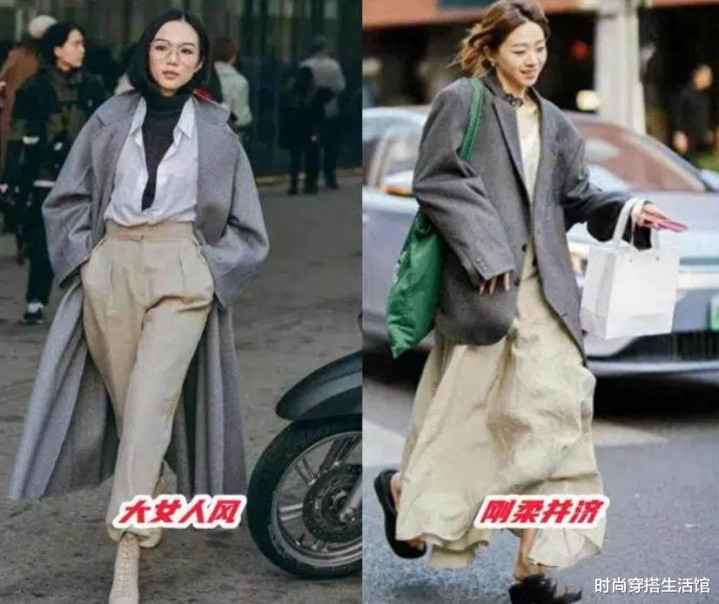 或者有些人会觉得说“格雷系”穿搭看起来非常的单一,那么我们究竟要怎么做才能更好地呈现出魅力和气质呢?让我们不仅可以塑造出优雅大女人,同时又能塑造出刚柔并济的气质,尤其是我们可以看到上图选择穿大衣的女性“大女人风”十足,穿西装更显简约和干练,整个人的穿搭气质瞬间就变得温婉和可人。